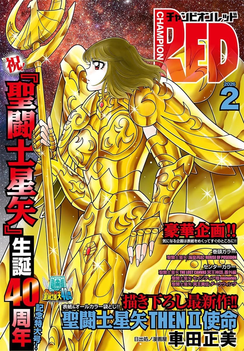 Revista Champion Red 2026 No.2 con portada de Saint Seiya ilustrada por Masami Kurumada.
