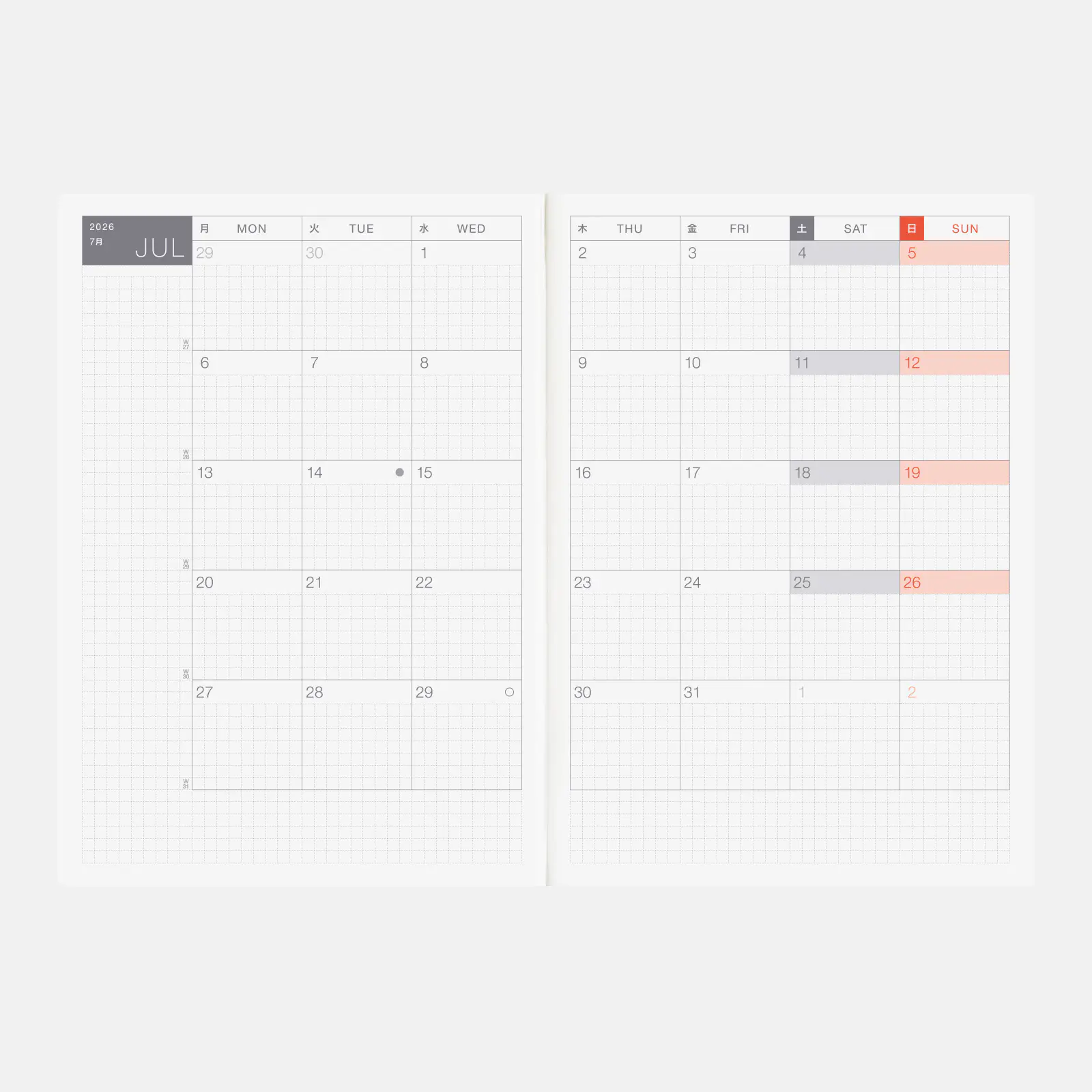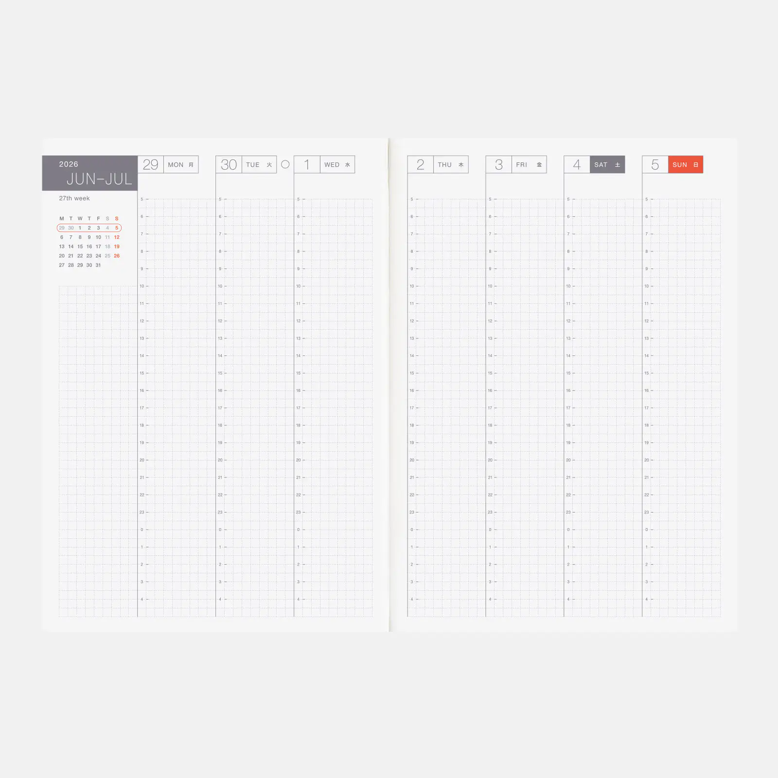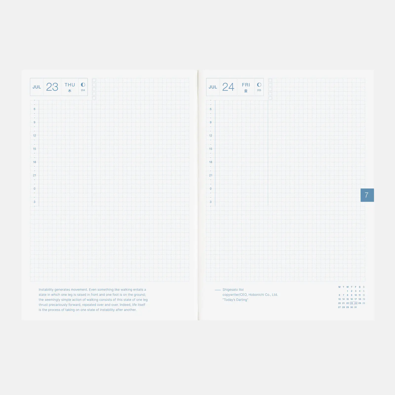Formato de una página por día, con cuadrículas de 3.7 mm y cada mes tiene un color diferente. Además, cada dos páginas, se incluye una cita especialmente escogida desde la página web de Hobonichi.