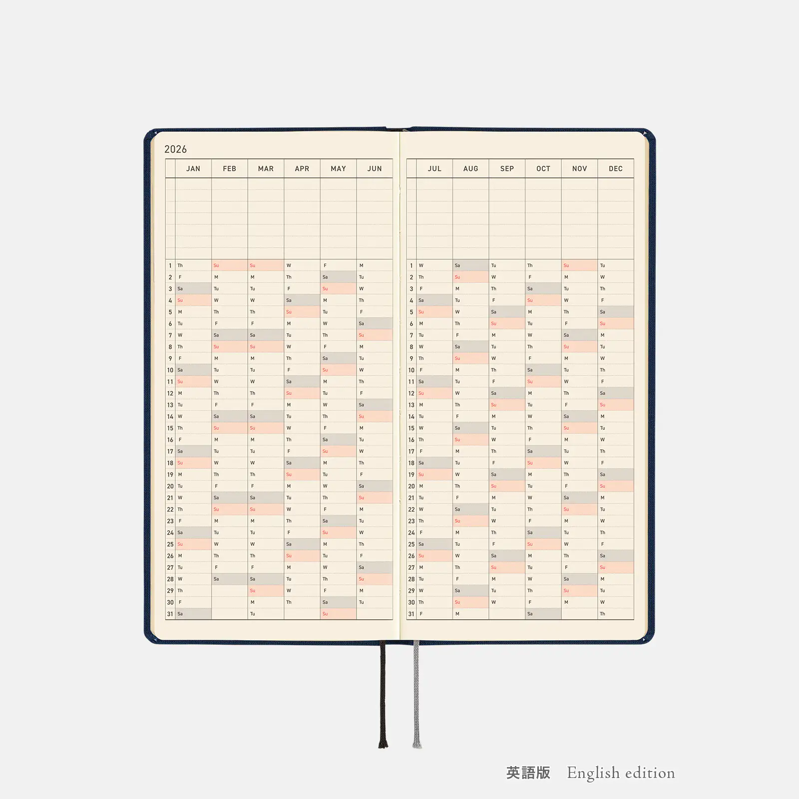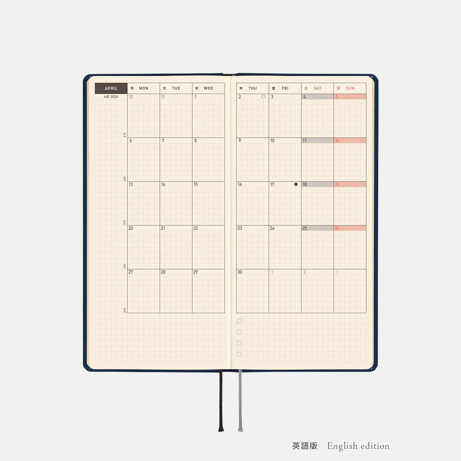 Edición en inglés de Hobonichi Techo 2026 Weeks (modelo a elección), cuenta con formato tapa dura, tamaño 18.6 x 9.5 x 1 cm aproximadamente e inicia en el mes de enero y los días lunes.