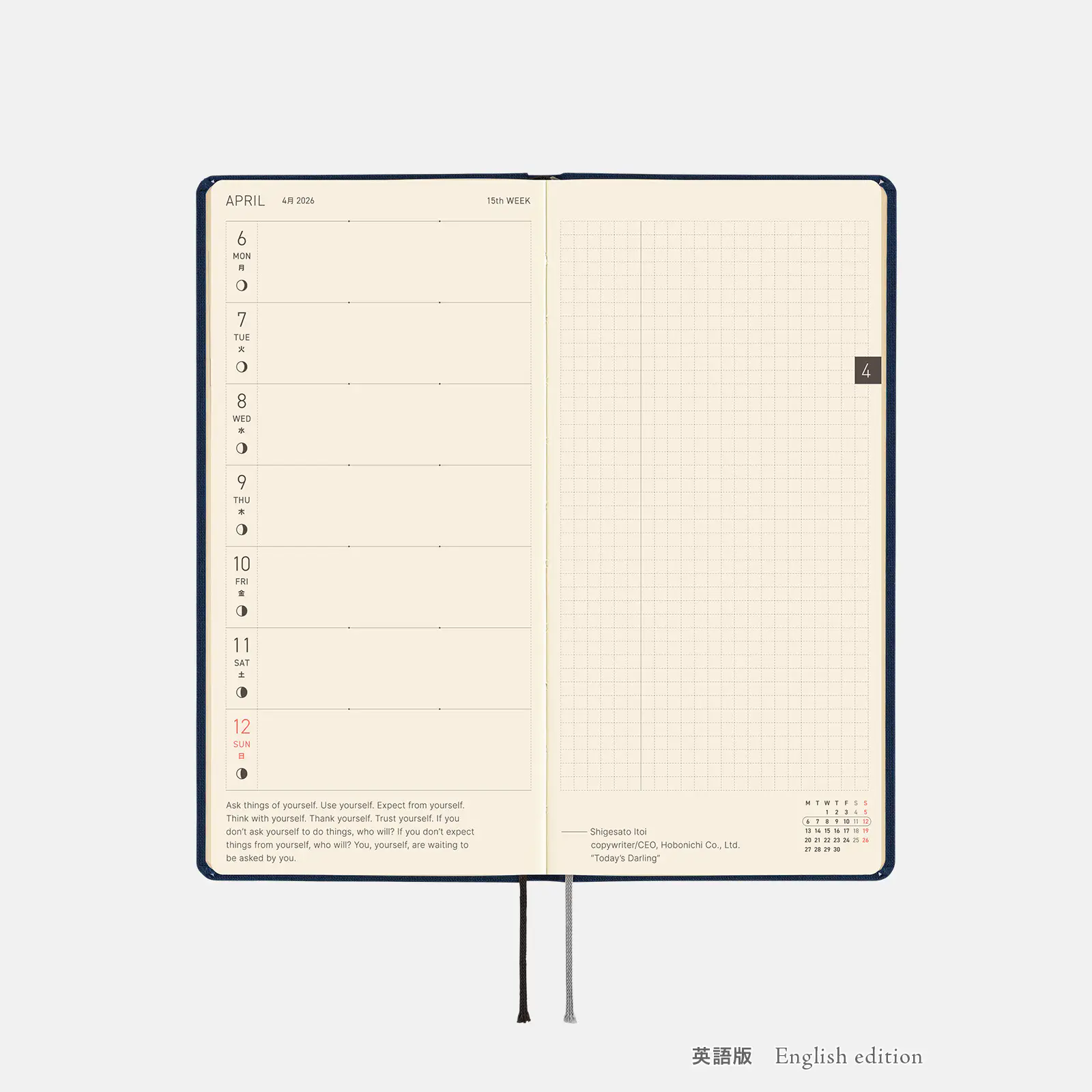 Hobonichi Techo 2026 Weeks cuenta con un formato de una página por semana y una página libre con cuadrículas de 3.55 mm para tomar notas. Además, cada página semanal incluye una cita especialmente escogida de la página web de Hobonichi.