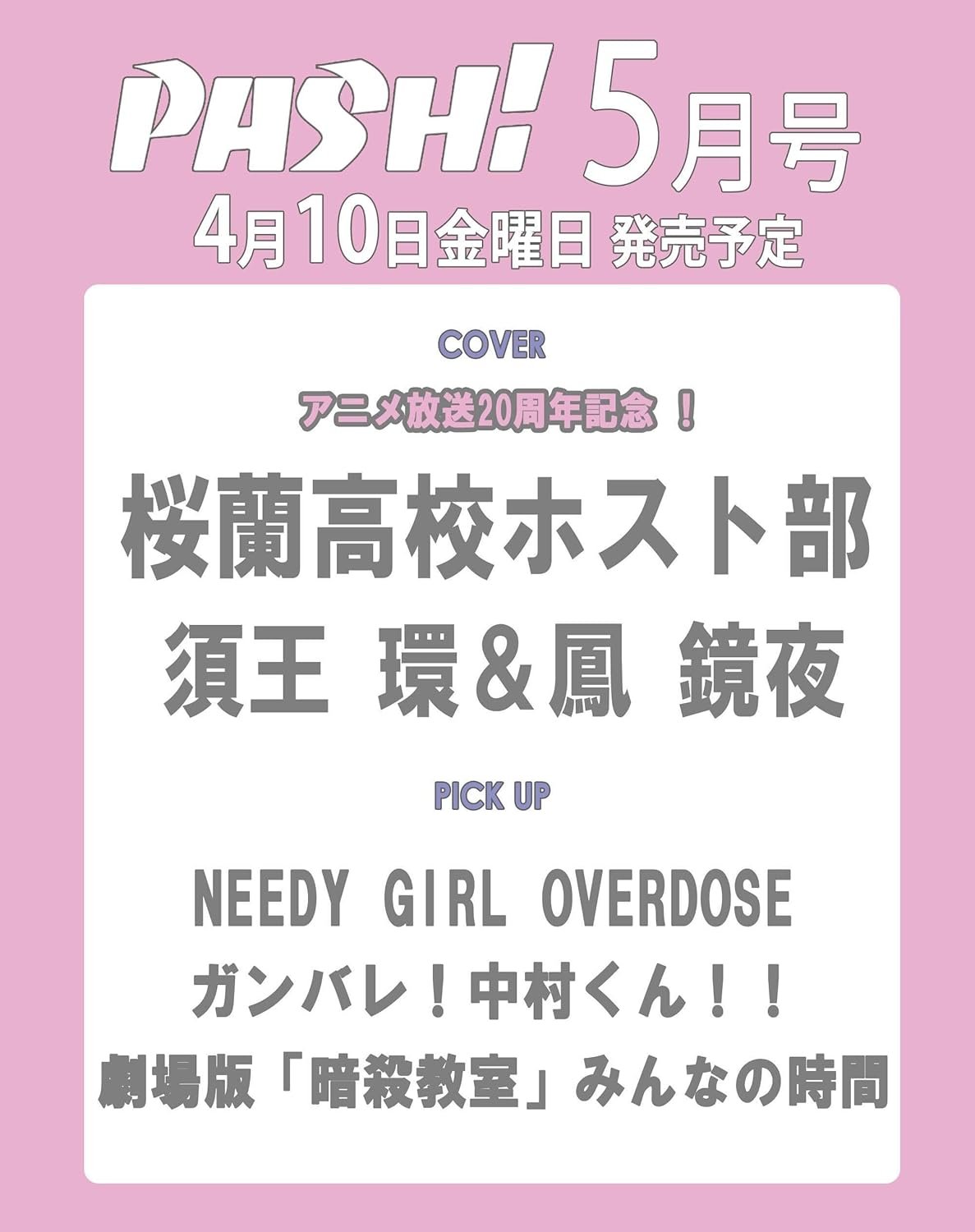Por la conmemoración del 20.º aniversario de la emisión del anime en la portada de la revista aparecerá Tamaki Suoh & Kyoya Ootori de Ouran High School Host Club.