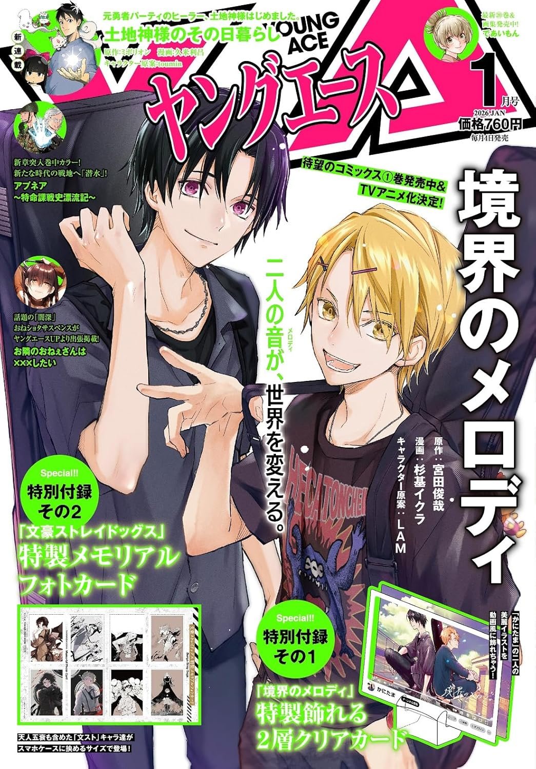 Revista Young Ace 2026 No.1 con portada de Kyoukai no Melody de Toshiya Miyata (Kis-My-Ft2) e ilustrado por Ikura Sugimoto.